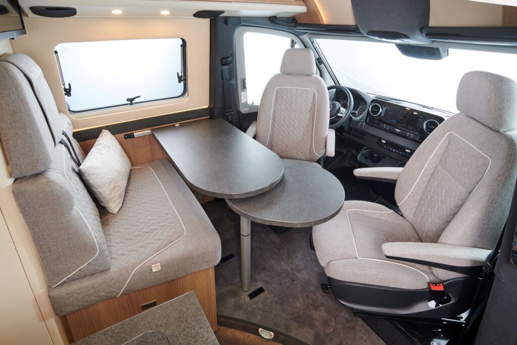 • Intégration de l’habitacle : Le cockpit avec ses sièges pivotants est parfaitement intégré au salon, créant une continuité spatiale avec une vue dégagée jusqu’à l’arrière du véhicule.
