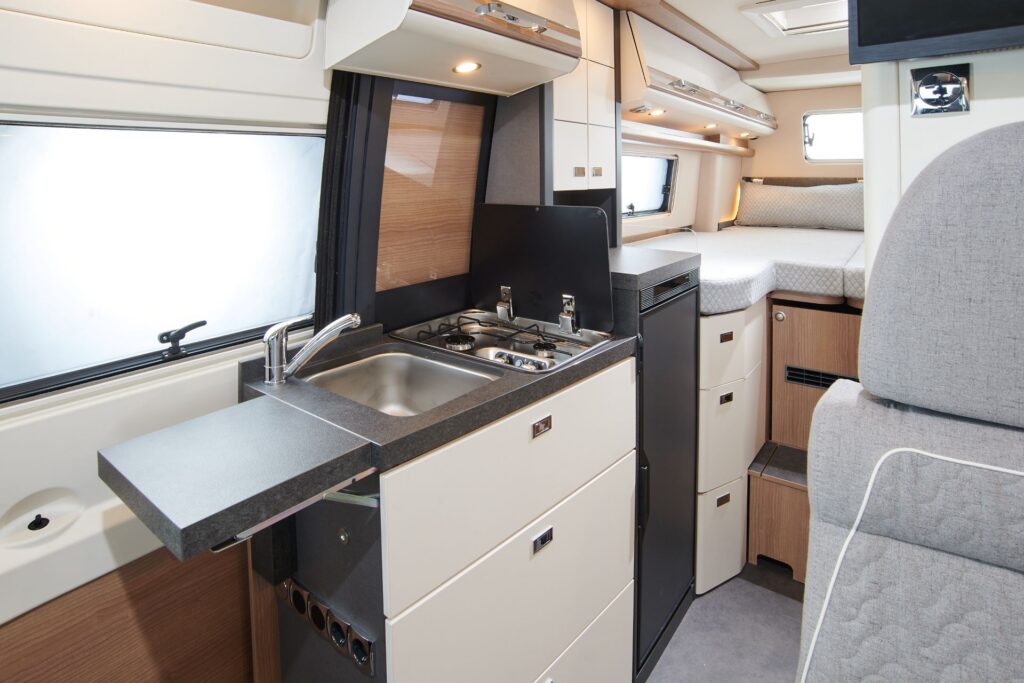 • Cuisine étendue : Une cuisine longue de 120 cm avec des rangements variés, incluant un réfrigérateur de 84 litres (c’est ok pour 2 mais pas plus !) et des plans de travail supplémentaires.