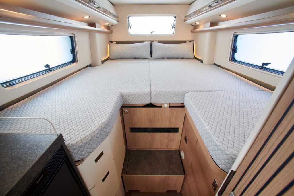 Pour tous les modèles, l’espace nuit a été embelli avec des revêtements beiges sur les montants d’angle et des habillages de baie gris, indirectement éclairés. L’effet est à la fois moderne et harmonieux, parfait pour des nuits paisibles sous les étoiles.