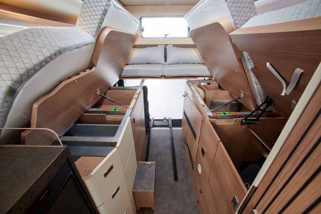 Les modèles Charming Coupé et GT Skyview se distinguent par un nouveau meuble de pavillon au-dessus du poste de conduite, conçu pour s’intégrer parfaitement au salon. Ce détail permet une meilleure fluidité entre l’espace de conduite et le salon, rendant l’ensemble encore plus accueillant.